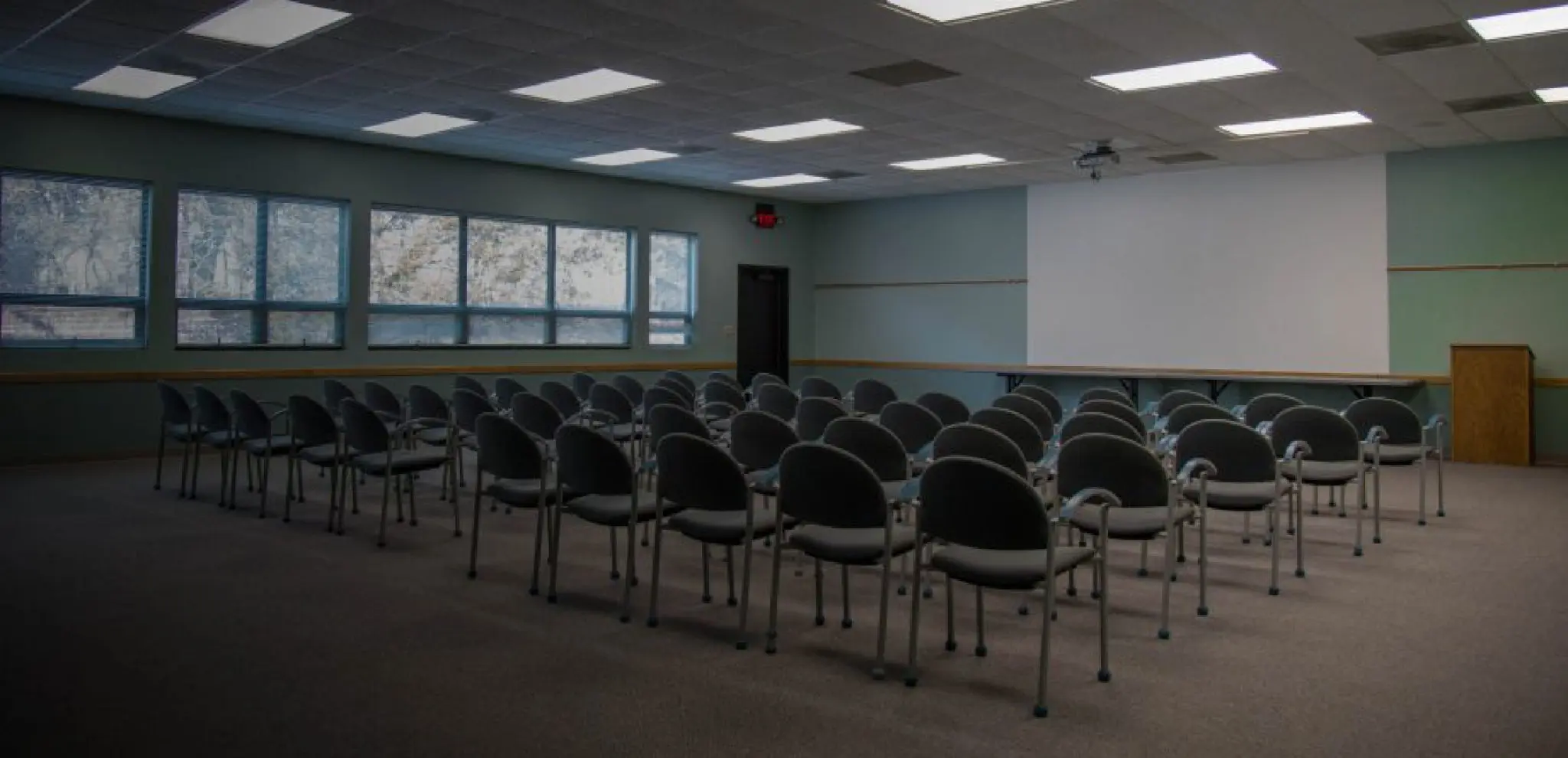 This room can be arranged a number of ways from front facing rows to smaller break-out groups and is suitable for large groups.