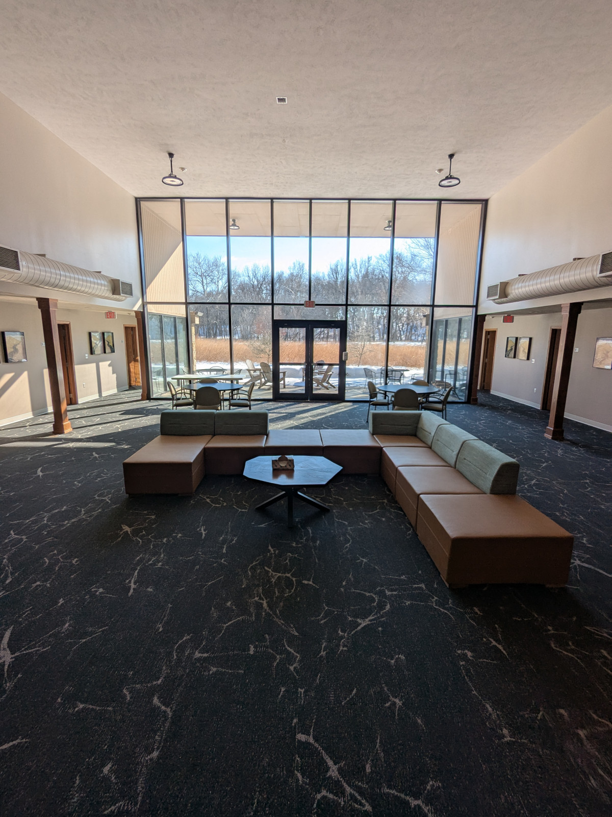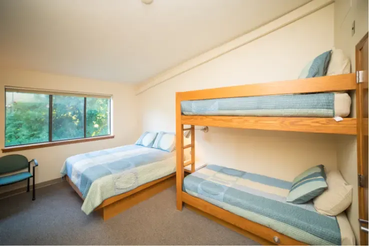 Leadership Lodge features a 20 ft vaulted ceiling with a wood burning fireplace, large living area with lounge furniture, registration desk area, and ice machine. Each private suite features a queen bed, a set of bunk beds, another queen bed in the loft, two bathrooms, desk space, and lounge furniture for a flexible stay.